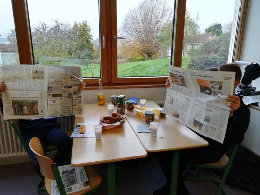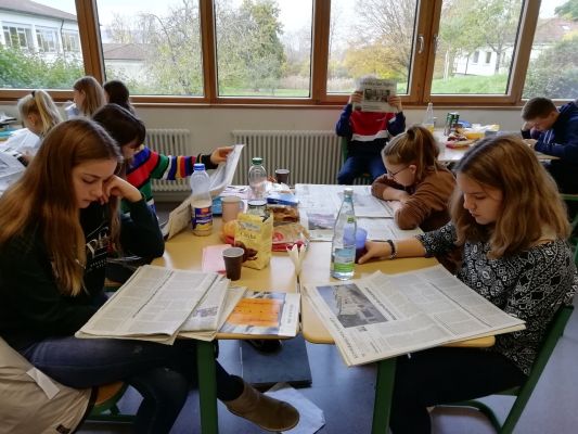 Bis Ende Januar ist das „Schwäbische Tagblatt" der ständige Begleiter im Deutschunterricht. Das Projekt mündet in eine Sonderbeilage, die ausschließlich aus Berichten der teilnehmenden Klassen verschiedener Schulen besteht. Unsere 8er werden dafür außerunterrichtliche Termine bei der Kreissparkasse und bei den Stadtwerken Tübingen wahrnehmen.