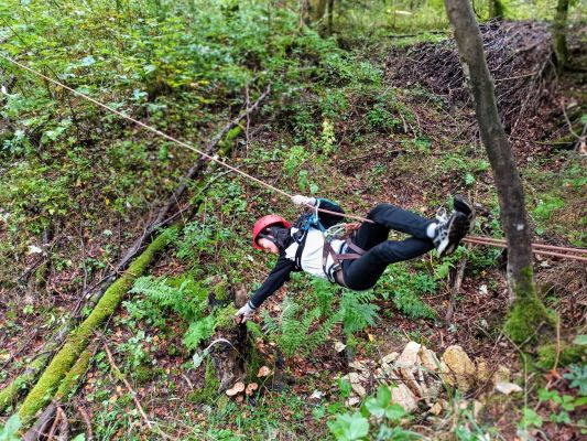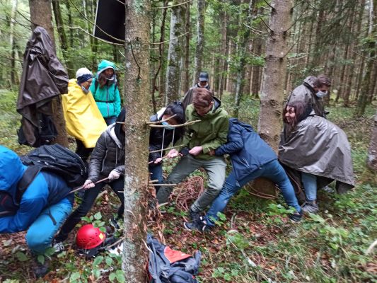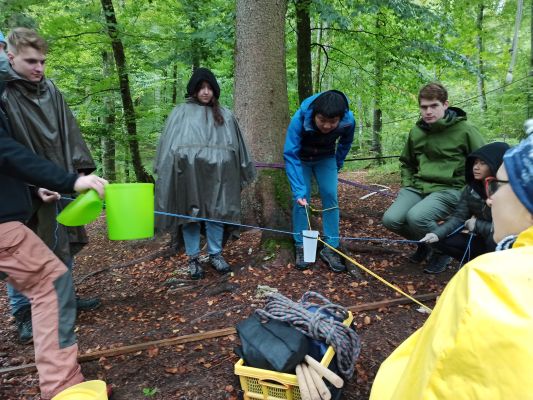 Wir wurden früh geweckt und genossen ein großes Frühstück. Es war ein kalter und nasser Tag. Um 9:15 Uhr fuhren wir los, um auf die Alb zu kommen. Wir stellten viele Fragen, aber uns wurde nicht verraten, was auf uns zu kommen würde. Als wir ankamen, standen wir erst mal eine halbe Stunde in der Kälte und bekamen danach Regen-Ponchos. Wir haben uns in zwei Gruppen aufgeteilt und haben eine Karte vom Wald bekommen. Unsere Aufgabe war es, von Punkt A zu Punkt B (einer Holzhütte) zu kommen. Die erste Gruppe durfte sofort loslaufen, während die andere Gruppe eine gemeinsame Aufgabe erledigen musste. Es wurde schnell klar, dass hierbei Kommunikation sehr wichtig ist, denn ohne diese wäre es unmöglich gewesen, die Aufgabe zu lösen. Danach durfte die zweite Gruppe auch loslaufen und mussten ihren Weg mithilfe der Karte und Kompass finden. Nach einer Stunde kamen beide Gruppen und die Betreuer an der gewärmten Holzhütte an. Dort durften wir unser Essen auspacken und eine kleine Pause machen. Nach der Pause gingen wir als große Gruppe in den Wald, wo Slacklines aufgestellt waren. Dieselben Gruppen von vorher bekamen jeweils ihren eigenen Kurs, den sie erledigen mussten. Die Betreuer hatten auch ihren eigenen Kurs. Wir mussten als Gruppe von einer Seite zur anderen kommen und einen Becher Wasser transportieren. Diese Aufgabe war schwer, aber alle Gruppen haben es letztlich doch geschafft. Es war wichtig, miteinander zu kommunizieren und einander aufzumuntern. Nachdem wir fertig mit den Slacklines waren, liefen wir zurück zu den Autos. Einige schliefen auf dem Rückweg im Auto ein. Als wir wieder im Internat ankamen, gingen fast alle auf ihre Zimmer. Abends wurde gegrillt und gemeinsam gegessen. Einige Schüler gingen nach Hause, aber die meisten blieben im Internat. Diejenigen, die dortblieben, schauten abends noch ein paar Filme und haben sich entspannt. Das Internatswochenende nahm nun ein Ende. Es war ein sehr schönes Wochenende, das uns alle etwas näher zusammen brachte. Dies war mein erstes Internats-Wochenende, und obwohl ich müde war, war es eine schöne Erfahrung, die ich gerne gemacht habe.