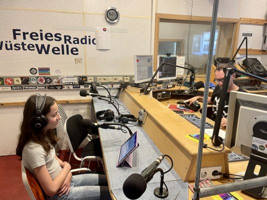 Es herrscht Aufregung. Jeder ist mit sich beschäftigt. Texte werden wiederholt und halblaut vor sich hingesprochen. Manche machen Übungen, um sich ein wenig zu beruhigen. Und dann geht es los: Kopfhörer auf. Mikro an. Das rote Licht leuchtet. Wir sind on Air, live im Radio. Die MuM- (Mensch und Medien-) Schüler:innen der Klasse 7a führen im