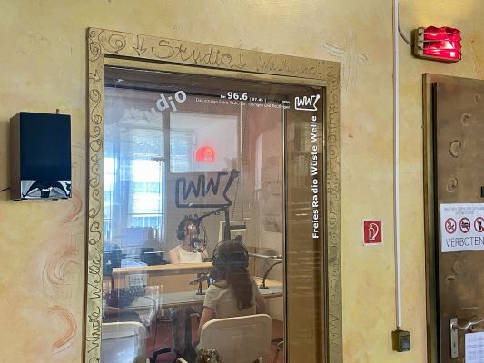 freien Radio Wüste Welle (UKW 96.6) in Tübingen am Dienstag, den 21.06.2022, von 16 bis 17 Uhr ihre eigene Radiosendung, einen sogenannten Bunten Beitrag, zum Thema "Social Media" durch. Matzel Xander (Bild, hinten rechts), Radioredakteur beim Sender, unterstützt uns, bedient die Technik und er hat auch die Sendungsverantwortung; ohne ihn wären wir aufgeschmissen. Ganz herzlichen Dank! Die Sendung eröffnen Luana und Tara mit einer Einleitung zu Social Media, danach thematisieren Liam und Valentin YouTube, Maximilian und Valentin Snapchat, Paul L. und Theo Instagram. Paul H. mit Unterstützung von Valentin beschließt die Sendung mit dem Unterthema TikTok, einer Zusammenfassung und Grüßen in die Welt. Die Sendung haben wir in einem Projekt gemeinsam erarbeitet. Dazu gehörte eine Einführung zum Radiojournalismus, Interviewtechniken, Projektmanagement und Recherchen zu Social Media. Eine besondere Herausforderung war, die mit dem Audiogerät aufgenommenen Interviewsequenzen am Computer mit dem Programm Audacity zu schneiden und sendungsfertig zu produzieren. Jetzt ist das rote Licht wieder aus. Die Aufregung weicht der Zufriedenheit nach getaner Arbeit. Ein besonderer Dank geht an Xenia Gäckle (Referendarin im ersten Ausbildungsabschnitt), dank ihrer Hilfe konnten wir problemlos hin- und zurückfahren und obendrein hat sie uns vor Ort mit praktischen Tipps und leckeren Keksen versorgt. Übrigens wer die Sendung nachhören will, erreicht sie