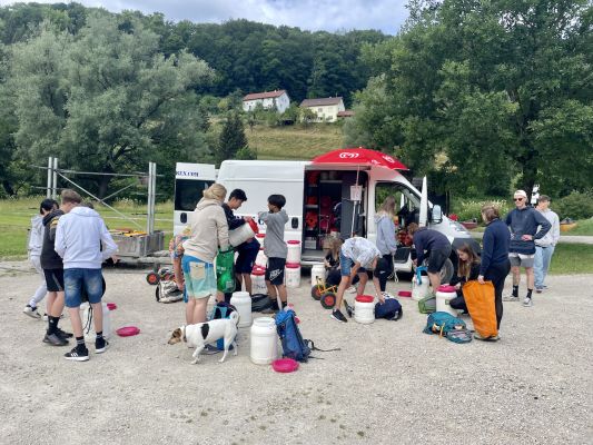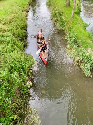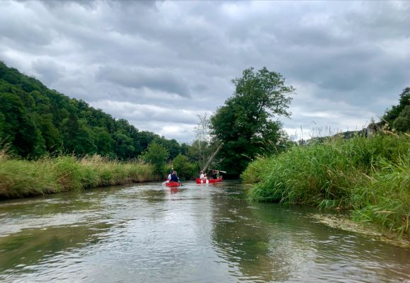 Seitlich hoch stehen die Büsche. Äste hängen tief. Ein leichter Wind weht. Die Lauter mäandert in endlosen Schleifen und Biegungen durch die Landschaft. Die Paddel gleiten rhythmisch diszipliniert in das Flüsschen. Aber ab und zu verengt sich das Flüsschen. Die Lauter wird tiefer, reißender, schneller und kleinere Stromschnellen sind zu überwinden. Dann übertönen die aufgeregten Laute der Schüler:innen das Gezwitscher der Wasservögel. Hier kann es schon mal vorkommen, dass sich ein Kanu quer im Flussbett verkeilt und sich mit Wasser füllt. Auch dafür gibt es eine Lösung. Zudem müssen mit zupackender Muskelkraft die Kanus auch zweimal über Land getragen und dann wieder zu Wasser gelassen werden. All das erlebte etwa die Hälfte der Klasse 8a (die andere Hälfte war leider krank) am 07.07.2022 bei ihrer vierstündigen Kanufahrt auf der Strecke von Münsingen-Buttenhausen nach Indelhausen. Und was bleibt zum Schluss? Muskelkater, nasse Kleidung und die Erinnerung an ein schönes Erlebnis in Gemeinschaft. Vielen Dank an alle für den tollen Ausflugstag. (Wm)