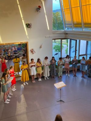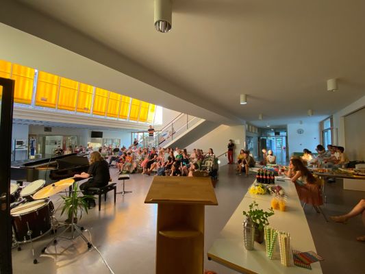 Ein leichtfüßig-beschwingtes Sommerkonzert in Loungeatmosphäre konnte man am Donnerstag, 14.7. in der Aula des EFG erleben. Der Chor, die Band 7up und Solisten präsentierten sommerliche Gute-Laune-Songs. Zwischendurch kamen in Poetry-Slams und einigen Stücken auch ernstere Töne zum Klingen. Schüler:innen der 8. und 10. Klasse verkauften Fingerfood und Getränke, die vom gut gelaunten Publikum genauso dankbar angenommen wurden wie das abwechslungsreiche Programm. (Za)