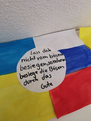 Als Schule, und gerade auch als evangelische Schule wollen wir hier als Schulgemeinschaft präsent sein mit verschiedenen Angeboten der Begleitung mit Gesprächen im Unterricht und Friedensgebeten und Projekten (Aktion „Friedenstauben" und verschiedene SMV-Projekte).