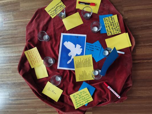 Die Friedensgebete am EFG wollen dazu beitragen, allen in der Schulgemeinschaft die Möglichkeit zu geben, an die Menschen in der Ukraine und allen von diesem Krieg Betroffenen zu denken und mit den Gefühlen und eigenen Ängsten umzugehen und gemeinsam Fürbitte zu halten.