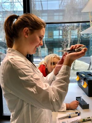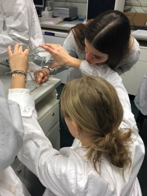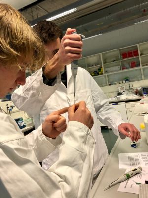 Der Tag begann um 10.00 Uhr mit einem kurzen Vortrag über das ZMBP, Verhalten im Labor und der Theorie zu den durchzuführenden Experimenten. Anschließend ging es ins Labor. Nach einer Einführung lernten die Schülerinnen und Schüler das richtige Pipettieren verschiedener Flüssigkeiten kennen.