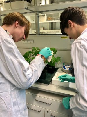 Ziel des 2. Experimentes am Nachmittag war es eine Tomatenpflanze mit einem Bakterium zu infiltrieren, um das Vorhandensein bzw. Fehlen der für die Immunreaktionen verantwortlichen Gene nachzuweisen. Bei diesem Experiment mussten wir zuerst die richtige Mischung aus Wasser und Bakterien finden, damit wir sie erfolgreich in die Pflanzen spritzen konnten. Die Ergebnisse dieses Experiments werden wir allerdings erst in ein paar Tagen erfahren.