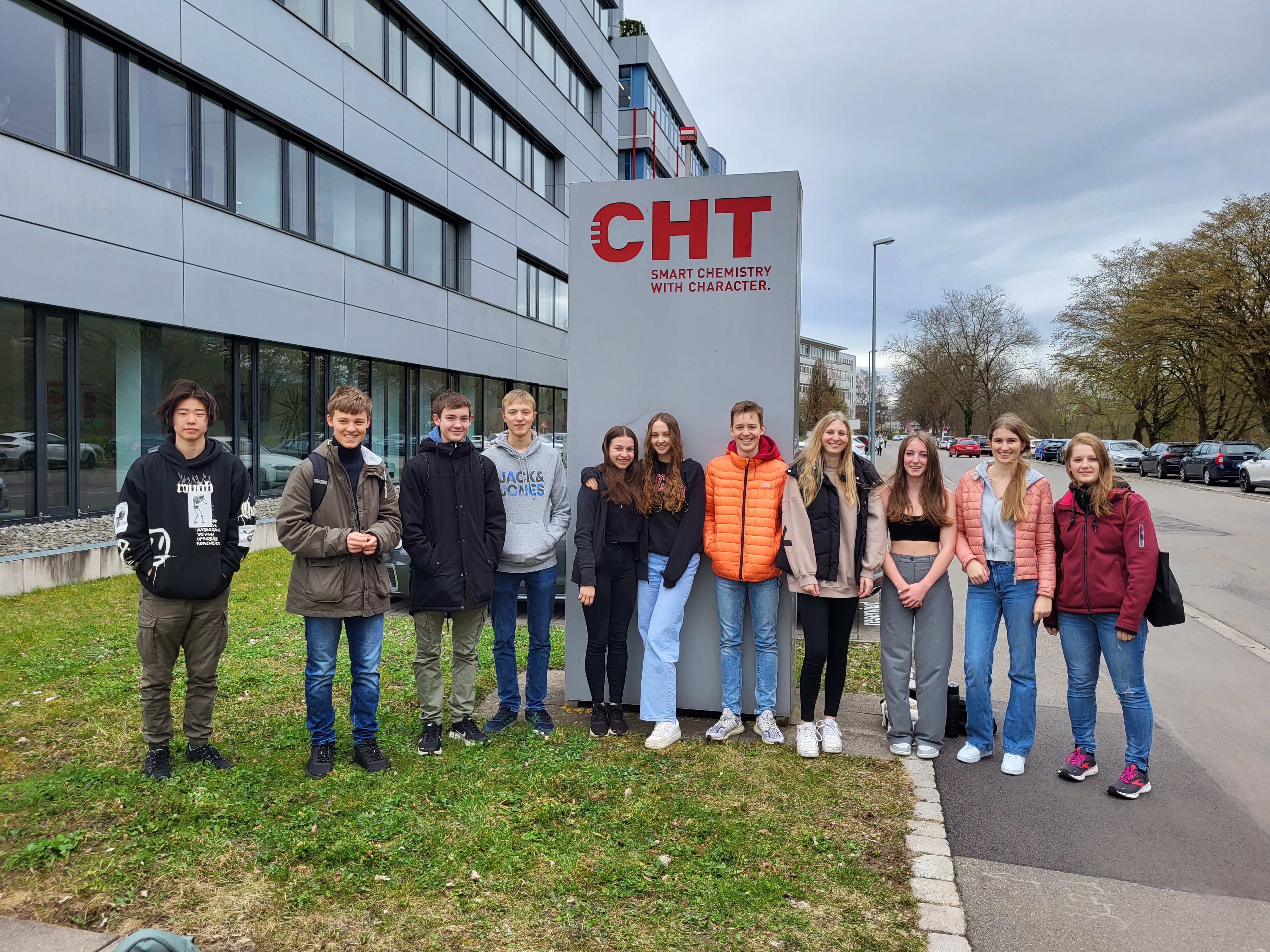 Am 23.03.2023 unternahm der Chemie-Leistungskurs der K1 zusammen mit unserer Lehrerin, Frau Dr. Eimer, eine Exkursion zum CHT in Tübingen, welches sich hauptsächlich mit diversen Beschichtungen von Textilien beschäftigt. Dort besuchten wir der Reihe nach vier Stationen in den verschiedenen Laboren des CHTs. An der ersten Station, der „Anwendungstechnik der Beschichtung" wurden uns unterschiedliche Beschichtungsarten, wie wasserabweisende Beschichtungen und nachhaltige Beschichtungen aus Olivenkernen für Putzutensilien präsentiert (Abrasive Dot Coating). Außerdem wurden diverse Tests an den beschichteten Textilien vorgenommen, um ihre Wasserfestigkeit und Hitzebeständigkeit zu prüfen. Wobei das sogenannte Wassersäulen-Testgerät verwendet wurde, um den maximalen Wasserdruck zu ermitteln, dem eine Beschichtung standhalten kann. An der zweiten Station beschäftigten wir uns mit der Instrumentalanalytik, um zu bestimmen, aus welchen Bestandteilen sich die fertigen Beschichtungen zusammensetzen. So kann die Fabrikation perfektioniert werden und geprüft werden, ob bei der Produktion keine unerwünschten Nebenprodukte entstanden sind. An den letzten beiden Stationen ging es schließlich um die Umweltanalytik. So wird zum Beispiel eine Kolonie von Daphnien (kleine Wasserorganismen) verwendet, um die Konzentration eines Stoffes in Wasser zu bestimmen, welche für genau 50% der Tierchen tödlich ist (LD50). Hiermit wird bestimmt, wie gefährlich ein Stoff für die Umwelt ist. Je geringer der LD50, umso gefährlicher ist der Stoff für Wasserorganismen. Als letzte Station haben wir die Entwicklungsabteilung besucht. Dort werden organische Stoffe entwickelt, die dazu führen, dass Textilien bestimmte Eigenschaften erhalten, wenn diese aufgetragen werden. Zurück im Chemieunterricht unternahmen wir am nächsten Tag dann ein kleines Experiment, bei dem ein kleiner „Scheiterhaufen", den uns das CHT spendierte, entzündet wurde, um zu testen, wie gut Löschdecken gegen Flammen schützen würden. Dabei gab es zwar „Verbrennungen" an der Teichfolie, welche die Haut repräsentierte, allerdings entzündete sich die Löschdecke selbst nicht, was das entscheidende Kriterium ist. Im CHT wird die Hitzeresistenz nicht nur mit dem „Scheiterhaufen" untersucht, sondern auch mit geschmolzenem Aluminium (660°C).