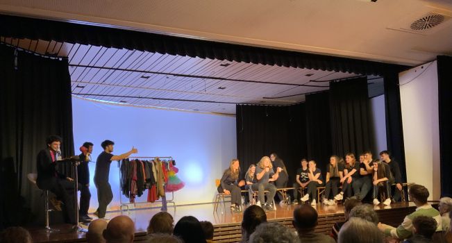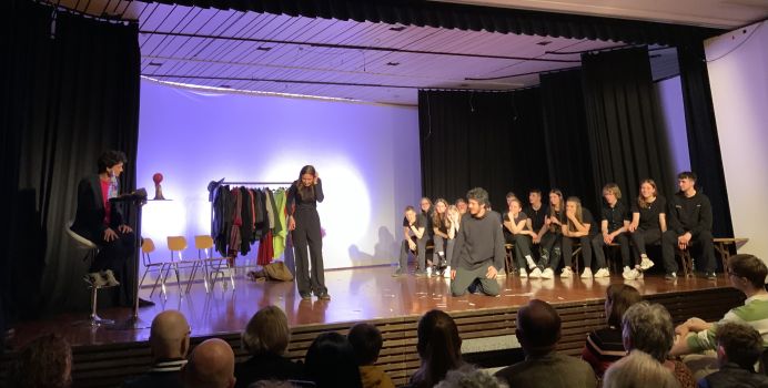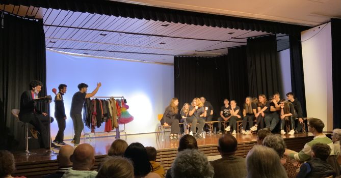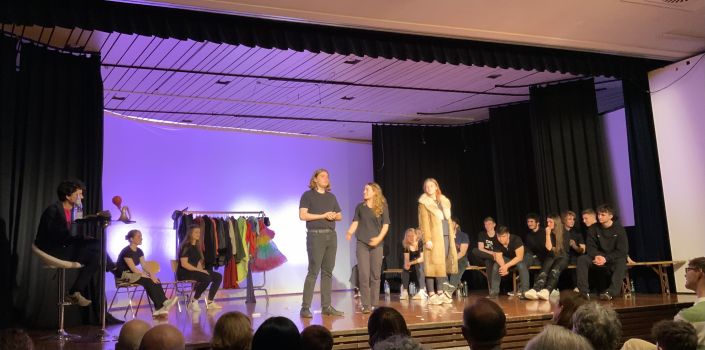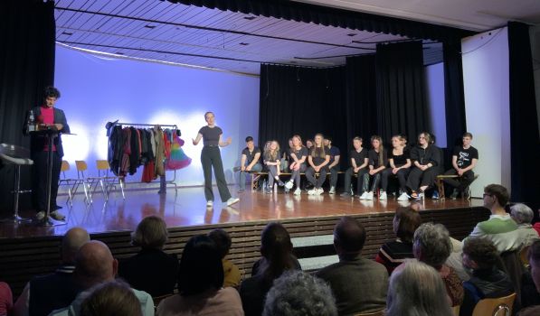 Beeindruckend war die Flexibilität und die Wortgewandtheit der Oberstufenschüler:innen, die sich mit ihrem Lehrer in der Woche zuvor noch zum „Trainingslager" ins Kloster Heiligkreuztal zurückgezogen hatten. Denn auch Impro will geübt sein, damit dann bei der spontanen Aufführung nicht die Worte fehlen. (Za)