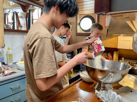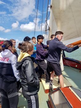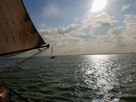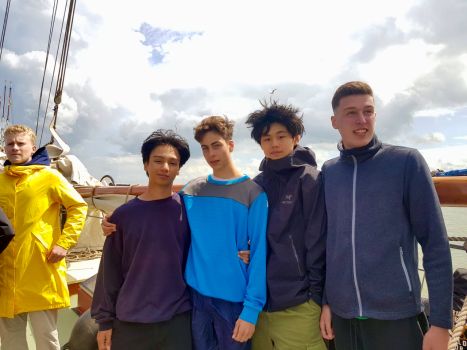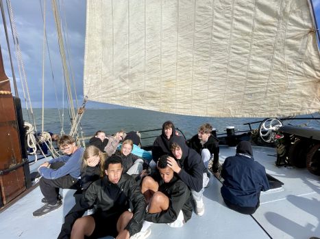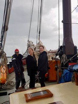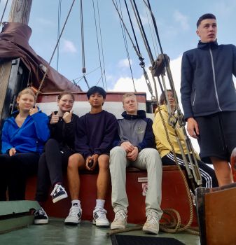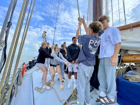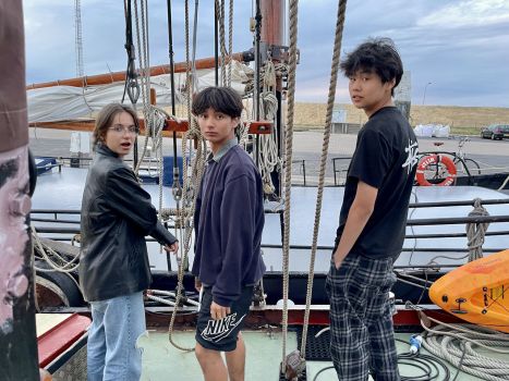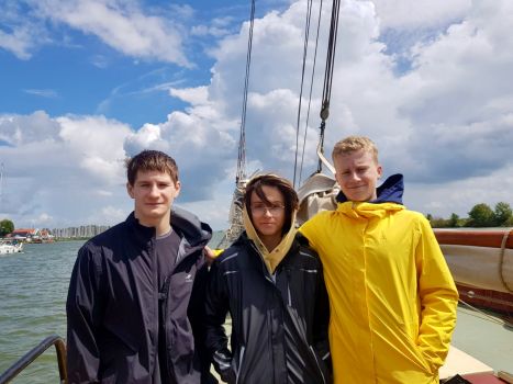 In Muiden lernten wir dann unsere Skipper und Maats kennen: Auf der Phönix begrüßten uns Patrick, ein entspannter Leichtmatrose ursprünglich aus Bochum, und Faber, ein seebäriger Kapitän mit Hang zum Tabak; auf der Anna Trijntje nahm uns Kapitän Stefan van de Valk in Empfang, ein Segler aus Leidenschaft, und sein Maat Yann, der einen Hang zum schrägen Humor hatte. Gegen 20 Uhr haben wir dann die Schiffe bezogen und der lange Ankunftstag ging mit einem gemeinsamen Essen (neun Kilo Spaghetti in Schinkensahnesoße) auf der Phönix zu Ende. Am Montagmorgen (17.07.) segelten wir schon 8 Uhr los, von Muiden nach Medemblik. Fast acht Stunden dauerte die Fahrt bei steifer Brise hart im Wind: Hauptsegel hoch, Hauptsegel runter, Focksegel hoch, Focksegel runter, Vorstagsegel hoch, Vorstagsegel runter. Das war zuweilen harte Arbeit. Wobei wir an der Stelle einräumen müssen, dass die Besatzung der Anna Trijntje mehr ran musste als die der Phönix. Denn hier wurde ganz gern das sogenannte fünfte Segel benutzt, der Dieselmotor. In Medemblik konnten alle die kleine Hafenstadt erkunden. Es wurde wieder gemeinsam auf der Phönix zu Abend gegessen. Später haben sich im benachbarten Park einige Jungs noch mit brandenburgischen Jungs im Fußball gemessen und sich wirklich gut geschlagen. Apropos schlagen: Zu vorgerückter Nachtstunde nahmen noch einige Besatzungsmitglieder beider Schiffe intensiv Kontakt mit Einheimischen auf und mussten von ihren Lehrern sicher zum Schiff eskortiert werden. Grenzerfahrungen gibt es eben sowohl auf dem Wasser als auch an Land.