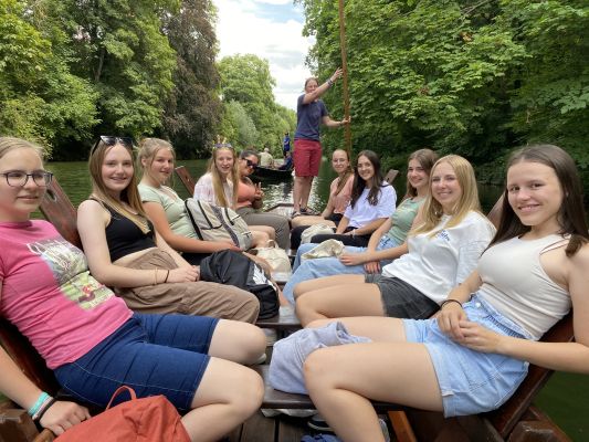Als wir im Museum fertig waren, haben wir 1,5 Stunden Freizeit bekommen. Nach dieser Zeit haben wir uns beim Evangelischen Stift getroffen und sind von dort aus zusammen zur Anlegestelle des Stocherkahns gegangen. Wir hatten einen Kahn für die Jungs und einen für uns Mädchen. Es war teilweise sehr wackelig und wir mussten immer schauen, dass unser Gewicht auf beide Seiten gleich verteilt war.