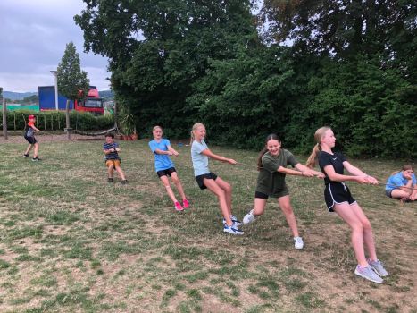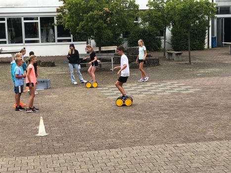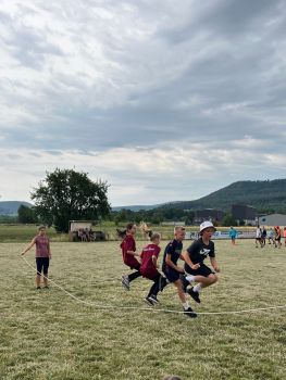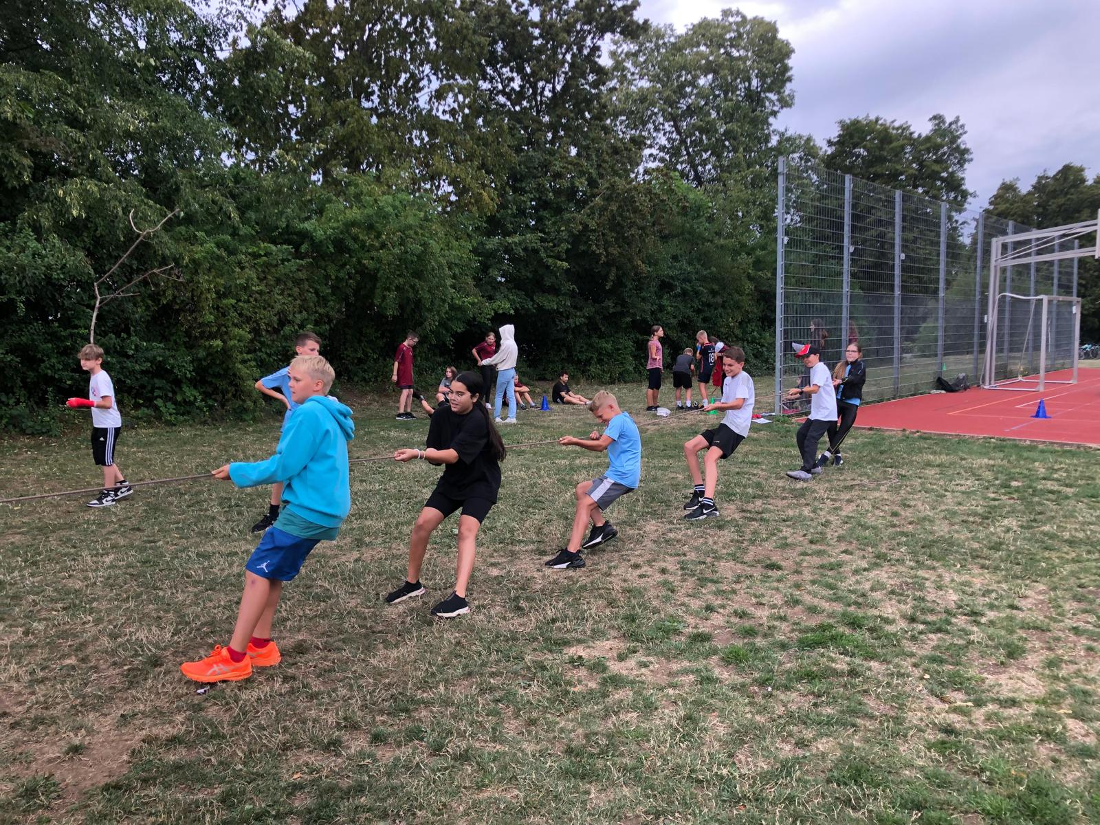 Für die Klassen 5-7 ging es in 7er – Gruppen zur Sommerolympiade, die über das ganze Schulgelände verteilt stattfand. An 12 verschiedenen Stationen durften die Teams ihr Können z.B. beim XXL-Seilspringen, Tauziehen, Dosenwerfen, Verkleiden, Pedalo fahren oder Fotoshooting unter Beweis stellen.