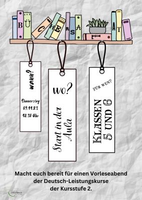 Wir, die beiden Deutsch-Leistungskurse der Kursstufe 2, veranstalten einen Vorleseabend für die Schülerinnen und Schüler des EFG Mössingen aus den Klassenstufen 5 und 6.