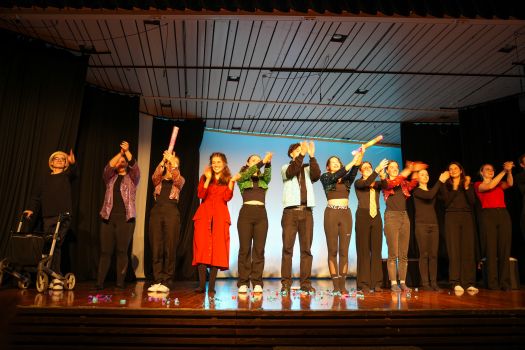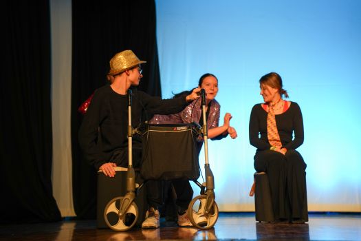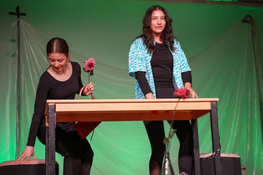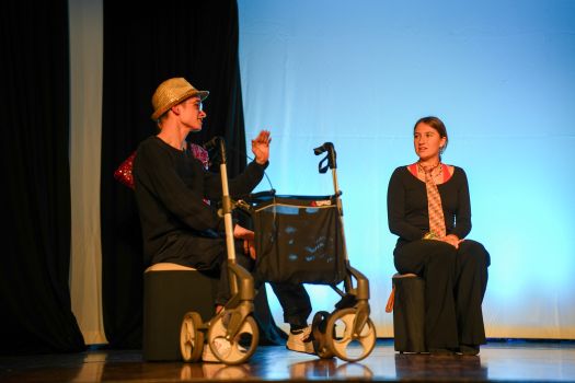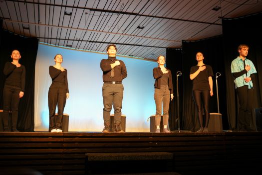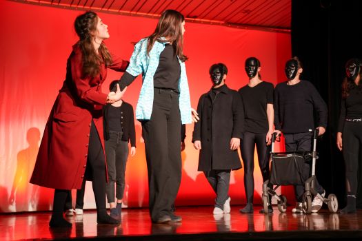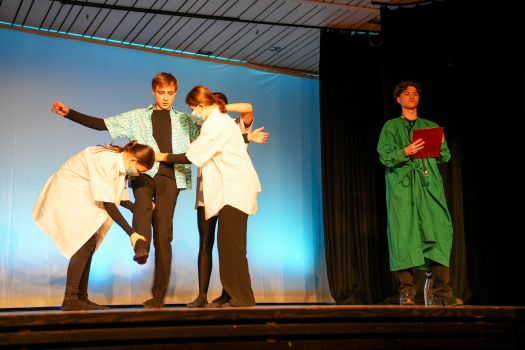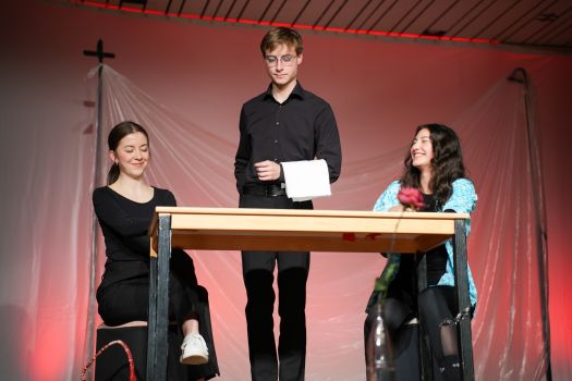 Das Theaterstück, welches an den Roman „Corpus Delicti" von Juli Zeh angelehnt ist, wurde vom Kooperationskurs aus 15 Schüler:innen der Abschlussjahrgangsklassen von Firstwaldgymnasium, Quenstedtgymnsium und Karl-von-Frisch-Gymnasium eigenständig entwickelt. Die Geschichte wurde episodisch verknüpft und die Schüler:innen zeigten dabei ein beeindruckendes darstellendes Spiel voller Engagement und Professionalität. Selbst der Lehrer des Kurses, Samuel Zehendner, sprach mit Stolz über die Kreativität und Selbstständigkeit seines Kurses, weshalb er nur ab und zu geholfen hätte. Denn bei dieser projektartigen Theaterarbeit wählen die Schüler:innen selbst ihr Thema, leiten das Projekt, führen Regie und Dramaturgie und kümmern sich um die Technik. Deshalb lässt sich also sagen, die Werkschau des Literatur und Theater-Kurses war ein großer Erfolg. Und die zahlreichen Besucher:innen der Veranstaltung gingen im besten Fall mit den Fragen nach Hause: Was ist Freiheit? Was bedeutet sie mir? Wie sollen wir lieben? Wie sollen wir leben? Was ist der Mensch? (Lotta Willenberg, K1)