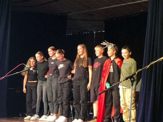 Die 6b stieg ein mit zwei Stücken auf dem Monochord, dem Klasseninstrument an unserer Schule. Im Anschluss führte die 7a drei ihrer Balladen-Vertonungen auf, mit selbst entworfenen Kulissen, Requisiten und, wie Konrad Heinz betonte, in eigener Regie entwickelt.
