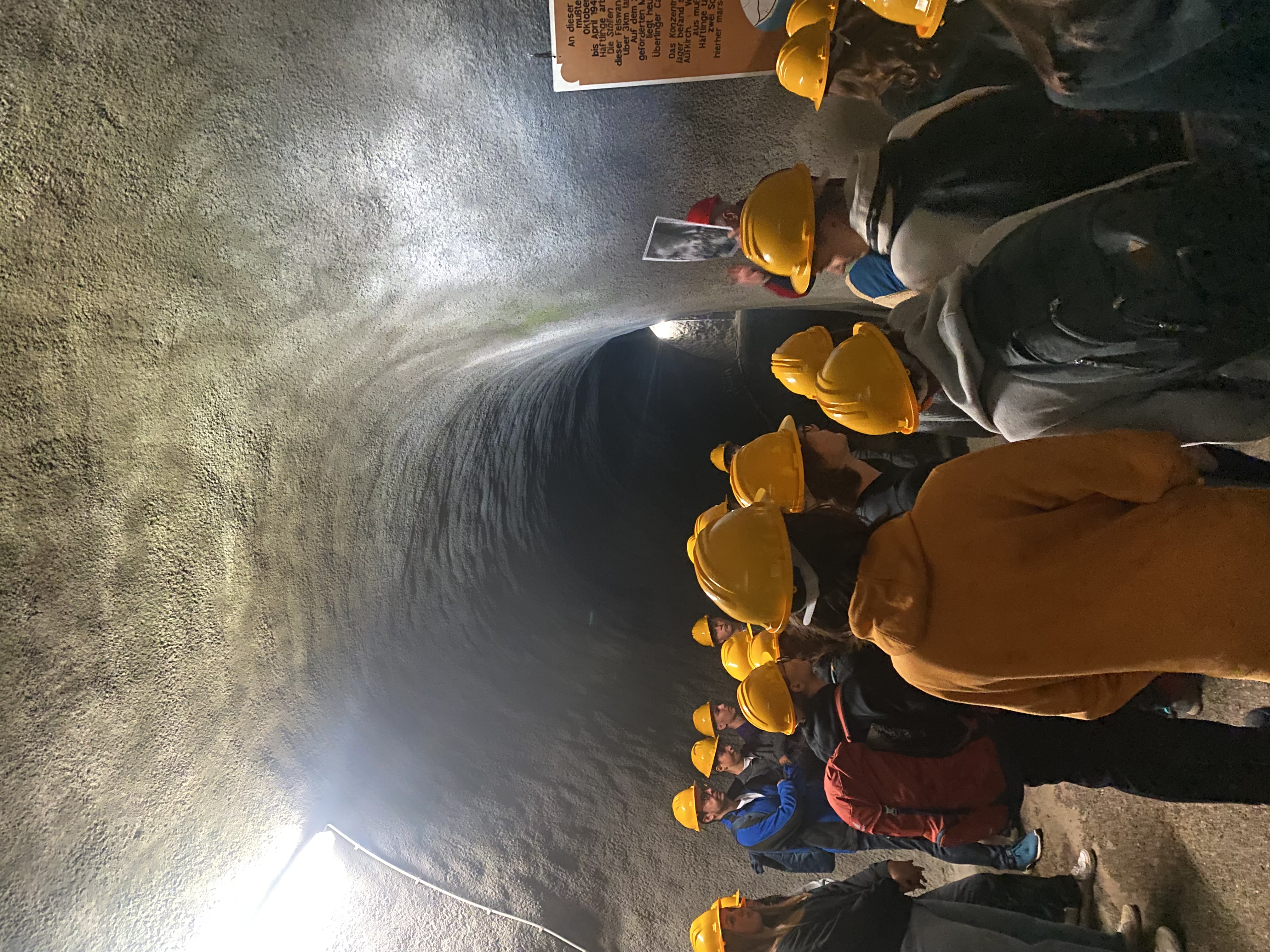 Unser Besuch begann mit einer Führung durch den Goldbacher Stollen. Da wir uns unter Tage aufhielten, war es im Stollen kälter als draußen, was aufgrund der Außentemperaturen durchaus angenehm war. Zudem mussten wir alle Schutzhelme tragen. Die Atmosphäre war aufgrund der Enge und Dunkelheit des Stollens eindrucksvoll. Der Guide informierte uns umfassend über die Lebens- und Arbeitsbedingungen der Häftlinge, die während des Zweiten Weltkriegs dort Zwangsarbeit leisten mussten.