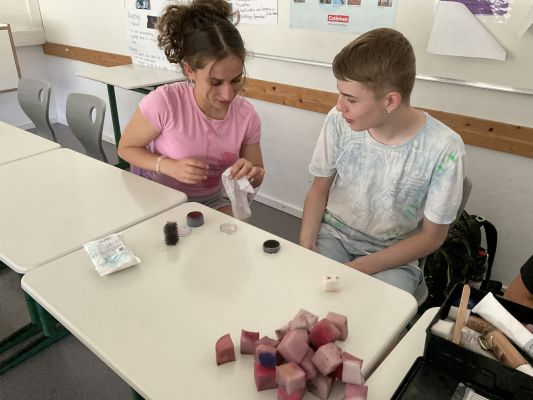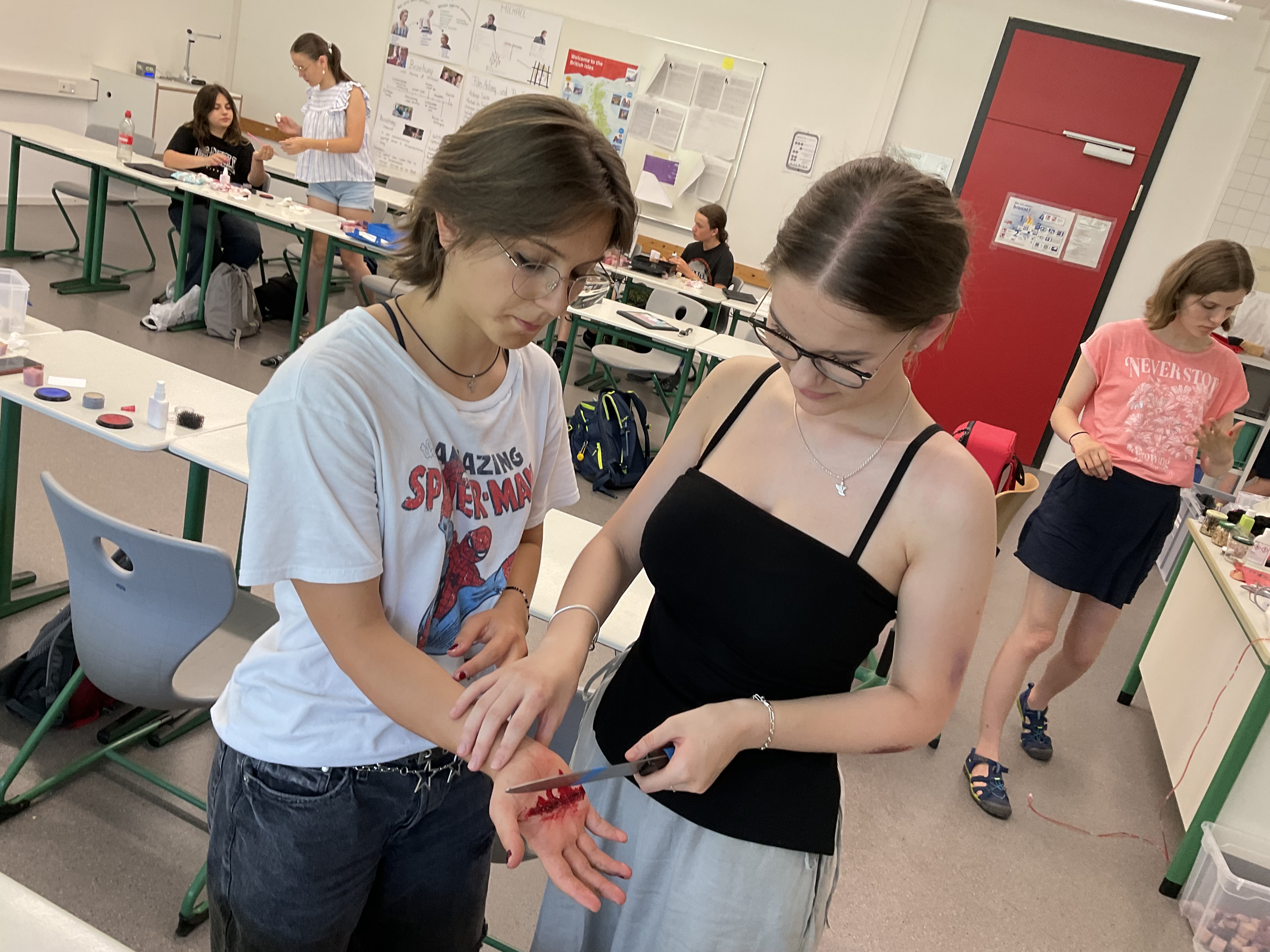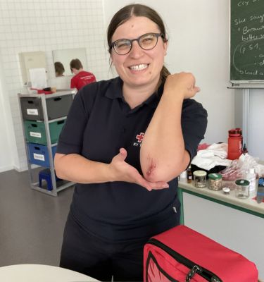 Am 9. Juli 2024 stellte Anna Pegios vom Deutschen Roten Kreuz (DRK) dem Schulsanitätsdienst (SSD) das Schminken von Schürfwunden, blauen Flecken und Schnittwunden vor. Dabei lernen die Ersthelfer:innen Angst vor Blut, Verletzungen und Schmerzreaktionen abzubauen und sich in die Situation der Verletzten hineinzuversetzen. Als Material hatte Anna Pegios Schminkschwämmchen, Wachs, verschiedene Schminke, Filmblut und diverse andere Utensilien dabei. Dabei sah viel sehr echt aus und es konnte einem schon übel werden. Hier hatte Frau Pegios ebenfalls Tipps wie Erbrochenes sehr real dargestellt werden könnte. (Em)