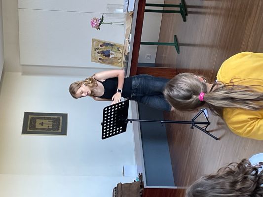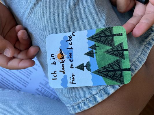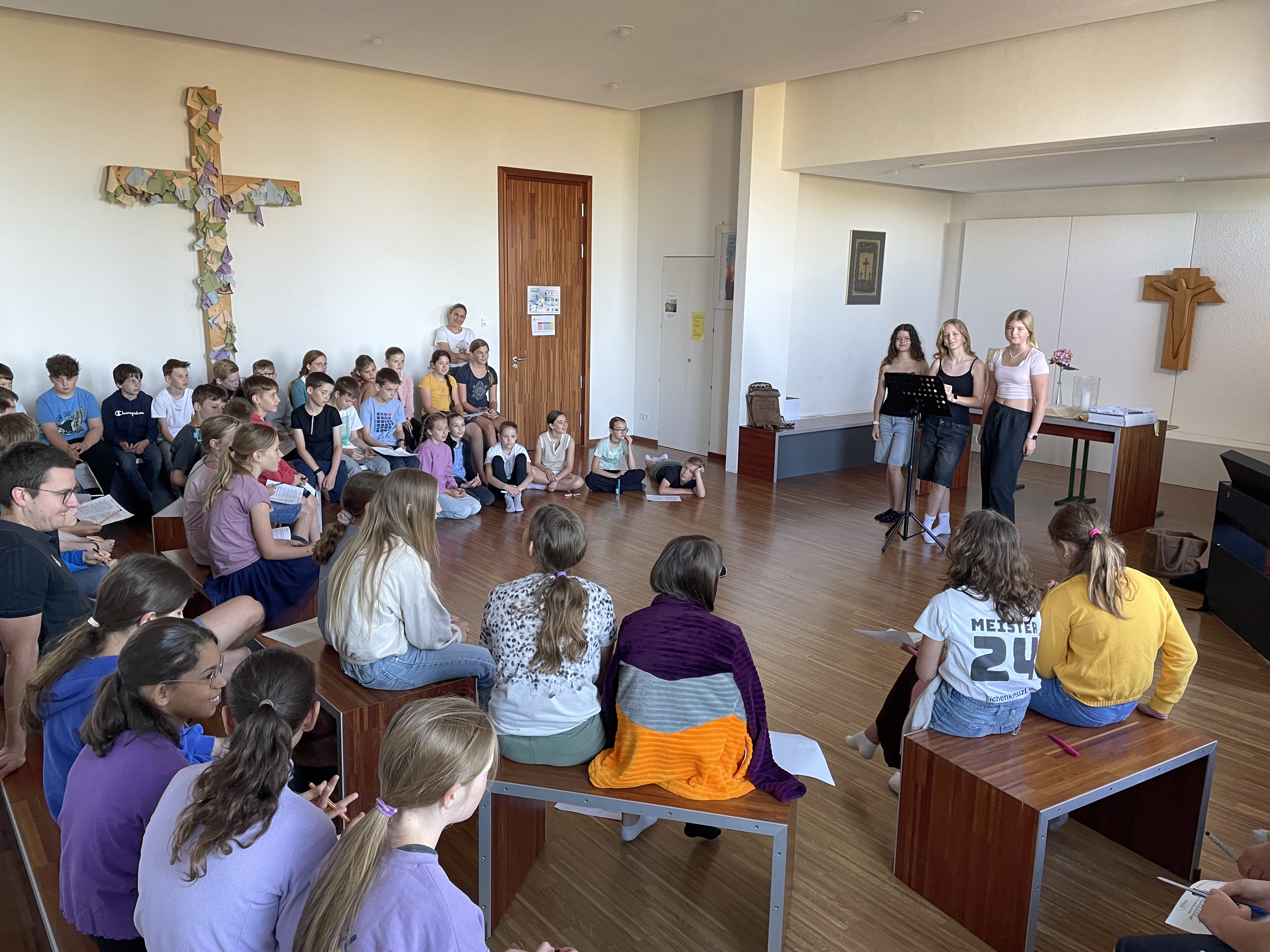 Montags in der 1. Stunden haben unsere 5. und 6. Klassen immer ihre Morgenkreis-Stunde, die diesen Montag, am 08. Juli 2024, von den Gottesdienstlotsinnen aus der 8b gestaltet wurde. Unter dem Motto „dankbar zurückblicken" luden Johanna, Marie und Charlotte die Klassen von Frau Schopp und Herrn Moldt ein zu einem kleinen Impuls. Dabei wurde den Schülerinnen und Schülern deutlich, wie viele Gründe zur Dankbarkeit sie haben und darüber hinaus bekamen sie einmal eine etwas anderes Bild von Gottes Nahesein, indem die Gottesdienstlotsinnen verkündeten: Gott ist manchmal wie ein Schwimmflügel!
