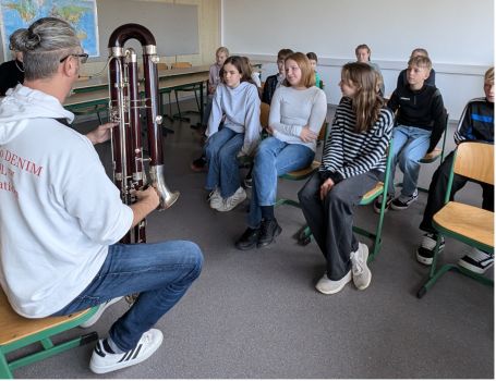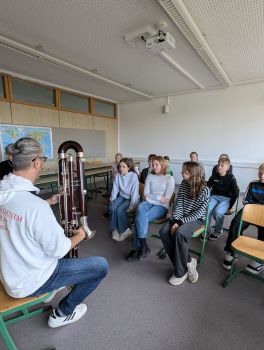 Der Musikvermittler der WPR, Oliver Hauser, führte die Klassen zunächst an der Schule in die Welt des Orchesters ein und stellte die weiteren Punkte des Projekts vor. Dabei erfuhren die Schüler:innen nicht nur vieles über Orchesterinstrumente und den Beruf der Profimusiker:innen, sondern lernten auch etwas dirigieren. Im Musikunterricht wurde der anstehende Probenbesuch im Probenstudio der WPR und der Konzertbesuch in der Stadthalle vorbereitet. „Sväng meets Orchestra" stand auf dem Programm. Sväng, ein finnisches Mundharmonikaquartett, musizierte gemeinsam der WPR zeitgenössische Kompositionen und Arrangements bekannter Werke von Chopin und Sibelius - Klänge und Rhythmen, die die Schüler:innen begeisterten. Eindrücklich war vor allem der Besuch der Probe, weil man die Arbeit der Profis ganz aus der Nähe verfolgen konnte. Einige Schüler:innen durften sogar ins Orchester sitzen. Weil sowohl Probe als auch Konzert von den finnischen Musikern auf Englisch moderiert wurden, konnten die Schüler:innen gleichzeitig ihre Fähigkeiten aus dem Englischunterricht unter Beweis stellen.