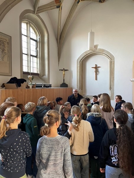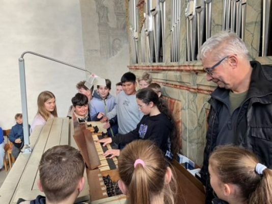 Am 04.12.24 schließlich ging es, nicht ganz so stramm marschierende – schließlich liegt die Peter- und Paulskirche schon fast um die Ecke – in ebendiese. Pfarrer Rieger erwartete uns schon und auch hier wurde die Wissbegierde unsere Schülerinnen und Schüler äußerst fachmännisch gestillt. Highlight waren dieses Mal weder der Ministrant noch das Tabernakel (denn beide sind bekanntermaßen in einer evangelischen Kirche eher selten anzutreffen) sondern vielmehr die prachtvolle und sehr wertvolle Orgel, auf der eine Schülerin sogar ein kurzes Vorspiel zum Besten geben durfte. Und so ertönte „Comptine d'un autre été" durch die Peter- und Paulskirche und kurz waren alle still und jeder hatte ein Lächeln auf den Lippen.