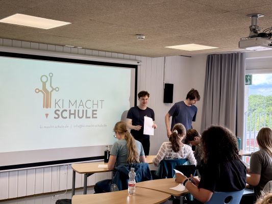 Auch auf die Problematik, dass KI mittlerweile fast alles für uns machen kann, wurde aufmerksam gemacht. Wenn wir doch eh nichts mehr selbst machen müssen, wieso müssen wir einen sechs-seitigen Aufsatz schreiben? Wieso müssen wir komplizierte Matheaufgaben lösen? Wieso müssen wir überhaupt in die Schule gehen, wenn wir alle den schlausten Computer in unserer Hosentasche haben? Diese Frage wurde uns von Matthias und Jonas beantwortet: Das alles wird gemacht, damit wir lernen zu denken.