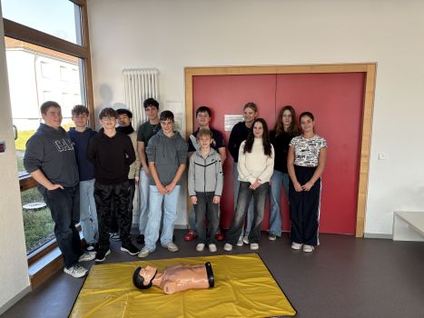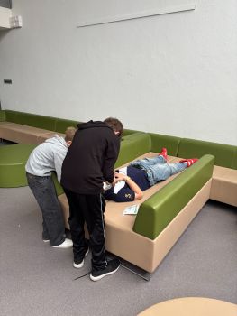 Am vergangenen Samstag fand die diesjährige Ausbildung der neuen Schulsanitäter:Innen am Firstwald-Gymnasium statt. Derzeit engagieren sich 16 Schüler:Innen aktiv im Schulsanitätsdienst und sorgen dafür, dass die Schule ein sicherer Ort ist. Dabei sind von der siebten Klasse bis zur Kursstufe 1 alle Altersstufen im Schulsanitätsdienst vertreten. Neben der Bereitschafts während des Unterrichts, den großen Pausen und der Mittagspause sind die Schüler:Innen bei Ereignissen wie zum Beispiel dem Crosslauf aktiv und kümmern sich um kleinere Verletzungen, haben ein offenes Ohr bei Redebarf aller Art oder stehen auch als Ersthelfer:Innen für den Ernstfall parat. Erste-Hilfe-Ausbildung der neuen Schulsanitäter:innen