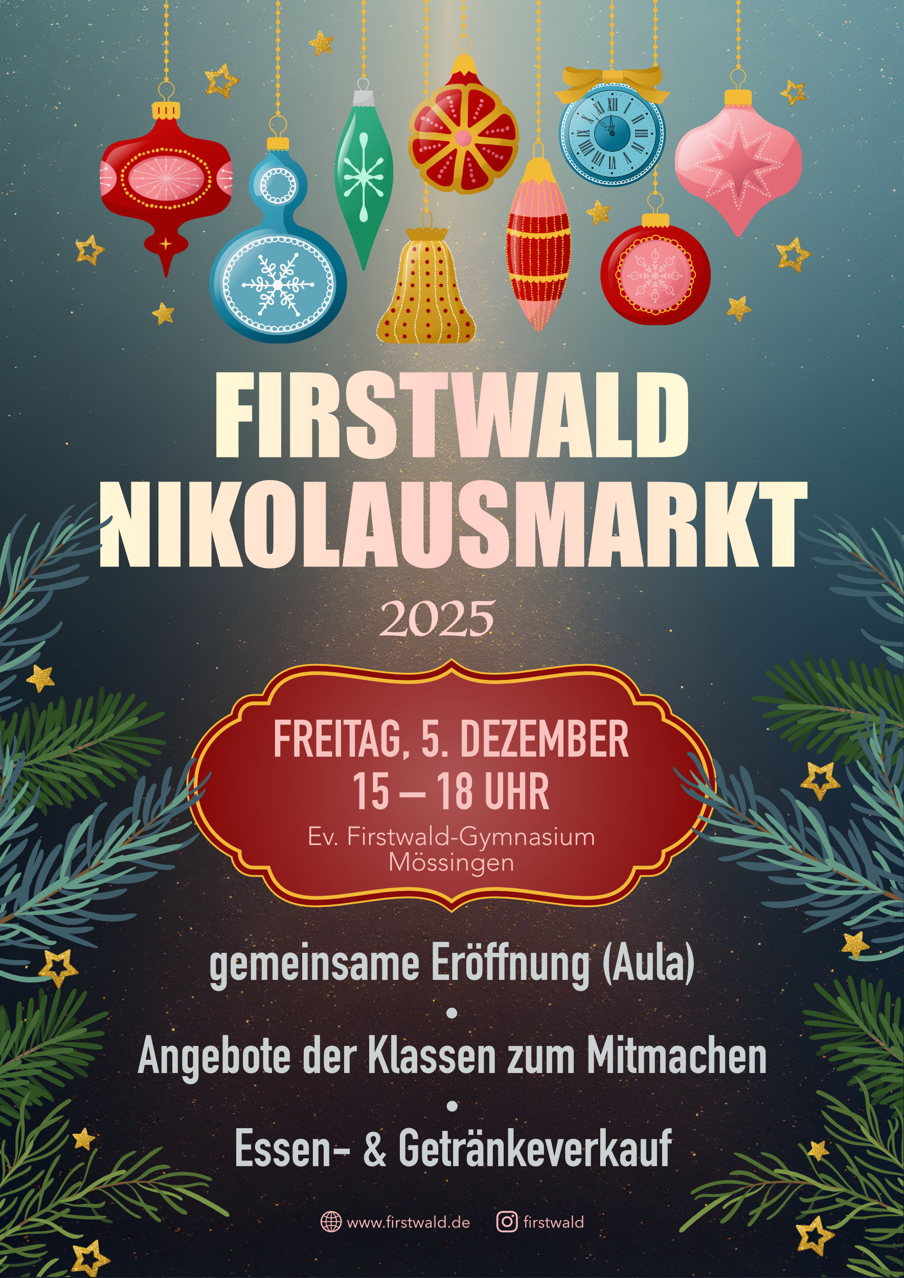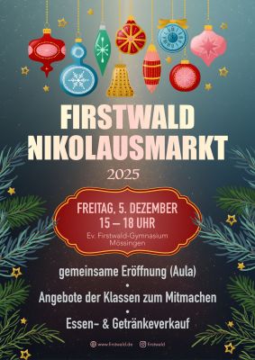 Am Freitag, den 5.12.2025 öffnen wir die Türen der Schule und der Klassenräume und laden Sie herzlich zum Nikolausmarkt am Firstwald-Gymnasium ein.