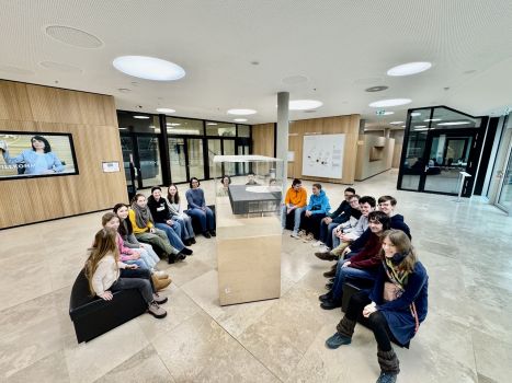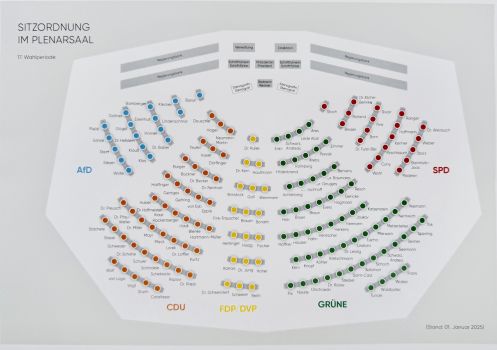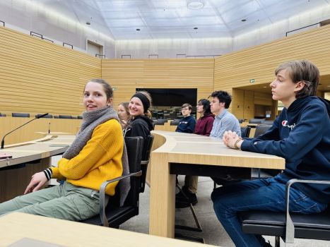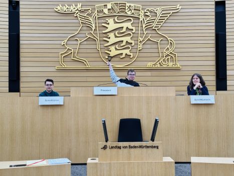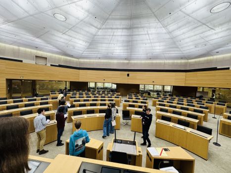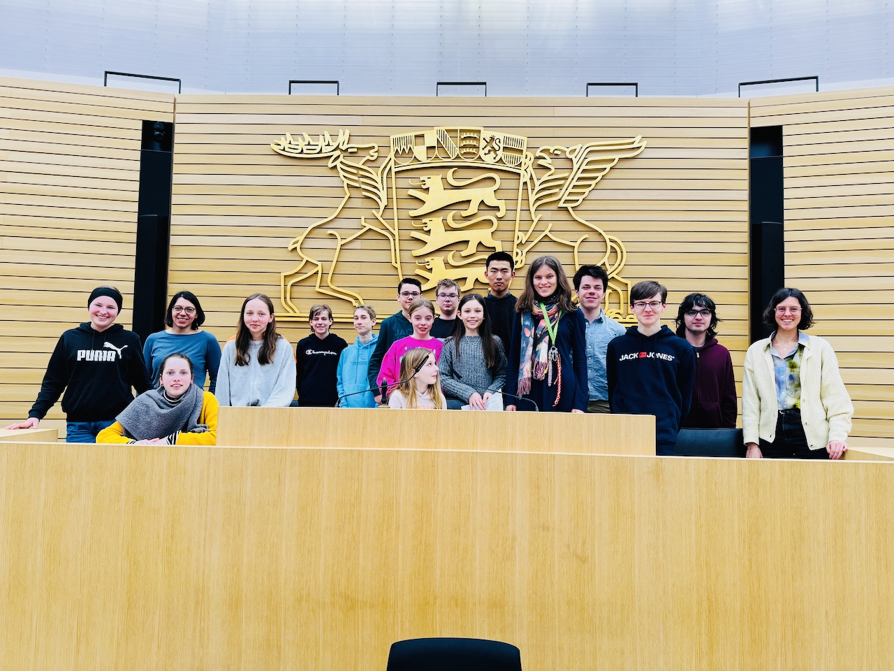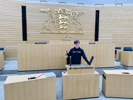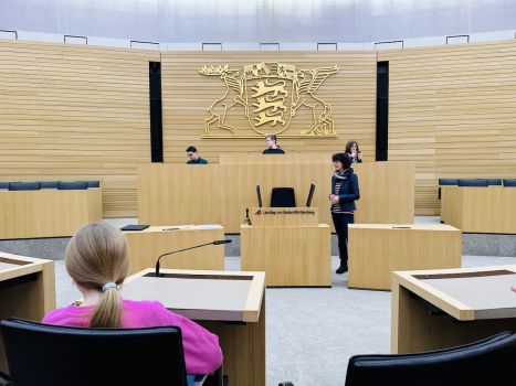 Kann man an einem Freitagmorgen Winfried Kretschmann im Landtag begegnen? Nein. Denn nur etwa dreimal im Monat müssen er und alle anderen Abgeordneten zu Plenarsitzungen nach Stuttgart kommen. Doch mit der Bahn reist er wahrscheinlich nicht an, denn in diesem Fall bliebe der Regierungssessel als auch sein Abgeordnetensessel möglicherweise leer. Die Anreise mit der Bahn in der Frühe ist tückisch. Diese Erfahrung machten auch wir. Am Morgen um kurz vor sieben Uhr versammelten wir uns – Schüler:innen von Klasse 5 bis 12 anlässlich des Firstwalder Kultur- und Wintersporttages am 14.02.2025 – bei leichtem Schneefall und kaltem Wind am Mössinger Bahnhof. Wir bemerkten schnell, dass man trotz eines gelben Doppelsignals sehr lange auf den Zug warten muss. Kälte, Verspätungen und Überfüllung verhinderten allerdings nicht unser Eintreffen im Landtag. Die freundliche Politologin des Besucherdienstes führte uns kenntnisreich und engagiert durch die Hallen der Macht. Ein übergroßer Bauer erweckte sofort unsere Aufmerksamkeit und es stellte sich heraus, dass jene künstlerische Installation kein Zufall ist. Denn die Schachfigur symbolisiert Artikel 20 GG, nach dem alle Gewalt vom Volke ausgeht. Und wie geht das? Unter anderem dadurch, dass wir alle fünf Jahre die Landesabgeordneten wählen. Und denen kann man im Untergrund des Landtages auf die Spur kommen. Dort befindet sich ein langer Tunnel, der das Abgeordnetenhaus jenseits der Konrad-Adenauer-Straße mit dem Landesparlament verbindet. Wir konnten uns sehr gut vorstellen, wie die Landesparlamentarier mit politischen Gestaltungswillen im hastigen Tempo hier hindurcheilen. Auf dem Weg dahin liefen wir auch über den Grundstein des Landtages, auf dem das Datum der Grundsteinlegung (24. Juni 1959) vermerkt ist und unter dem in einer Box wichtige Informationen verborgen sind. Wenn die Abgeordneten sich in jenen unterirdischen Gewölben bewegen, verpassen sie dennoch nichts, weil die Informationen live aus dem Plenarsaal über Lautsprecher in alle abgelegenen Räume von A wie Abgeordnetenbüro bis W wie WC übertragen werden. Der eigentliche Höhepunkt für uns Besucher:innen wartete im Plenarsaal selbst. Hier erfuhren wir von Glocke, Stenograf und Präsidentin, von Schriftführern, Rednerpult und Regierungsbänken. Wir fragten uns: Hat jede und jeder Abgeordnete einen festen Platz? Ja, außer unser Ministerpräsident. Dieser hat sogar zwei, weil er zugleich als Abgeordneter der Grünen gewählt wurde. Das führt wohl manchmal zu einem Rollenkonflikt, der auf dem Weg zwischen den Stühlen intrapersonal geklärt wird. Zwischen vielen weiteren Informationen zu Gesetzen, Parlamentsgebaren und Legislatur, zu Presse, Fraktionen und Architektur haben wir auch noch die dynamische Beweglichkeit der Abgeordnetensessel selbst erprobt. Das Hin und Her, das Wippen und Schaukeln, das Drehen im Kreis hatte durchaus eine entspannende Wirkung. Zum Ende hin wurde vor lauter Wissensdurst und Aufenthaltsfreude die Zeit etwas knapp und wir mussten den Plenarsaal über die Lobby unter dem Geräusch der Glocke wieder verlassen. Der Austritt aus dem Gebäude wurde noch etwas verzögert, denn die Sicherheitsschleuse wollte uns nicht gleich freigeben.