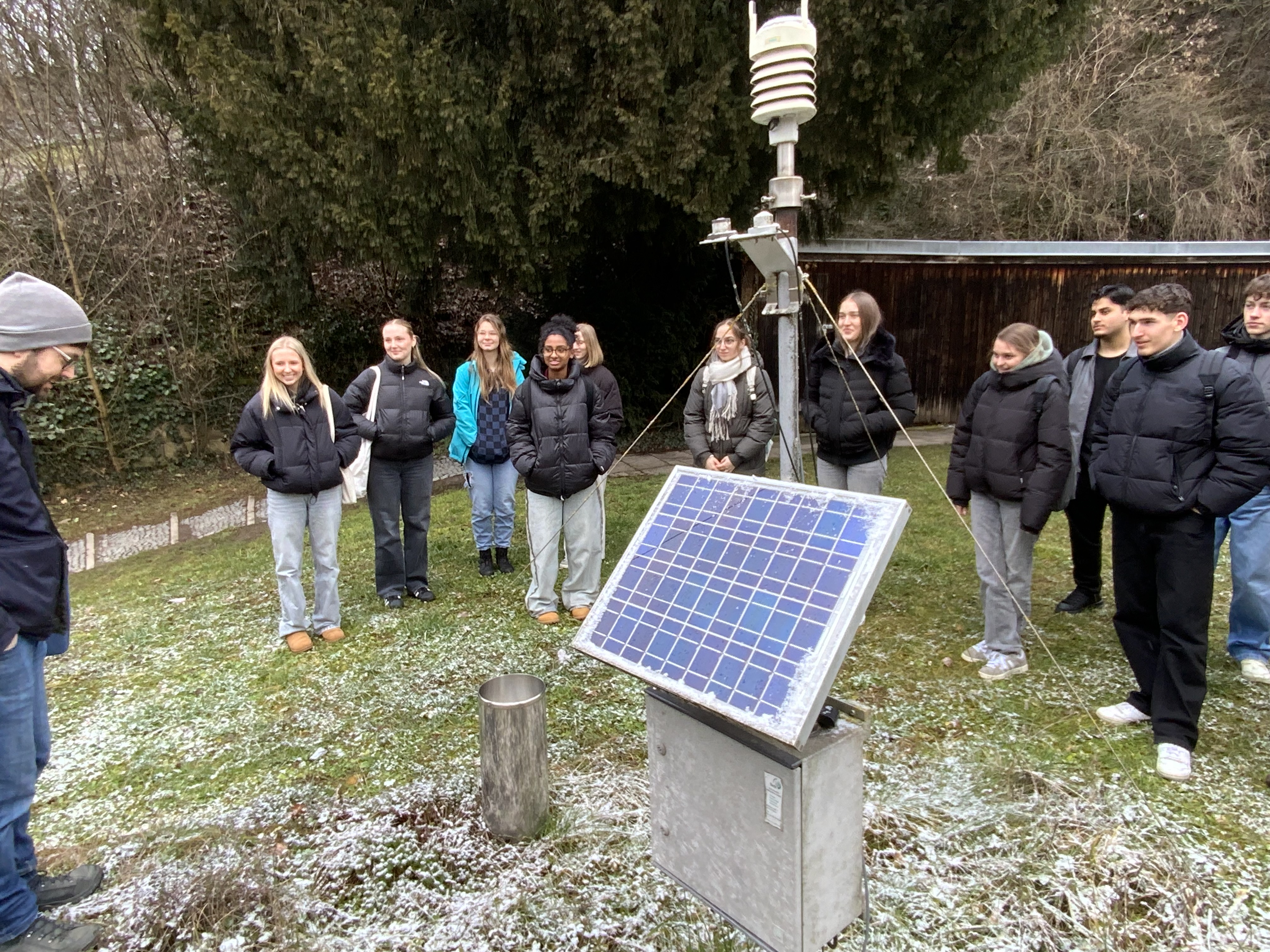 Anschließend erklärte uns Herr Dr. Andreas Braun die Funktionsweise der Klimastation, die sich im Garten des Instituts befindet. Diese liefert kontinuierlich Daten zu Niederschlag, Temperatur, Windgeschwindigkeit und Windrichtung, Luftdruck und solarer Einstrahlung. Diese Daten dienen unter anderem als Grundlage für verschiedene Forschungsarbeiten. Als Wiederholung und Vorbereitung auf die anstehende Abiturprüftung, wurde im Hörsaal die aktuelle Wettersituation vor Ort analysiert und auf Grundlage der im Unterricht erarbeiteten Inhalte erläutert.