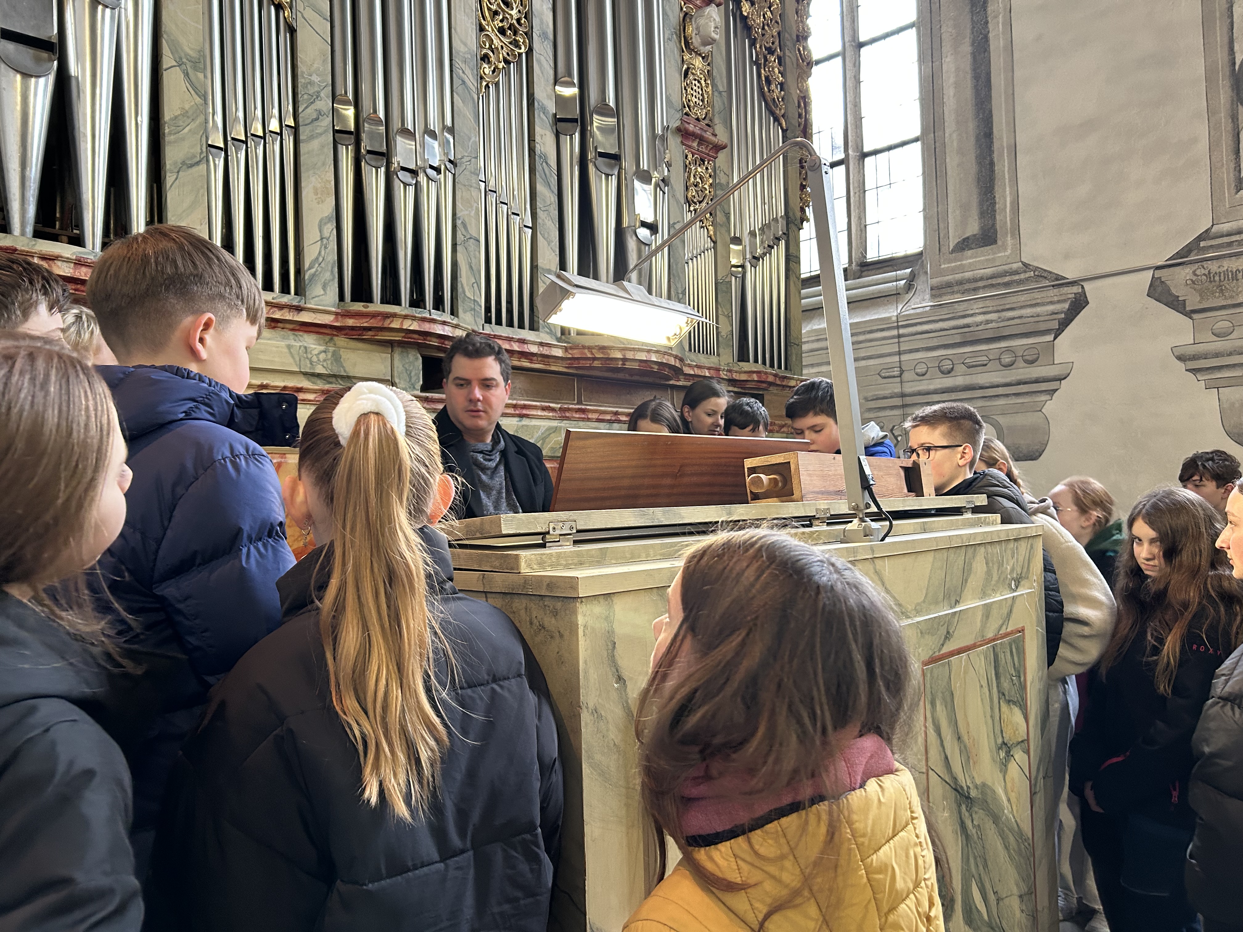 Dort hat Nikolai Ott, der dort Bezirkskantor ist, uns erst gefragt, was wir schon über die Orgel wissen und danach die grundlegenden Dinge der Orgel genannt. Im Anschluss hat er uns an einem Beispiel die verschiedenen Register erklärt. Nikolai Ott hat uns dann noch erklärt, wie der Ton bei der Orgel erzeugt wird. Er hat uns gezeigt, wie die Verbindung von den Tasten zur Pfeife verläuft. Dabei durften wir sogar einen Blick in das Innere der Orgel werfen. Außerdem hat der Bezirkskantor berichtet, dass die gesamte Orgel im Sommer restauriert wird und dies sehr aufwendig ist.