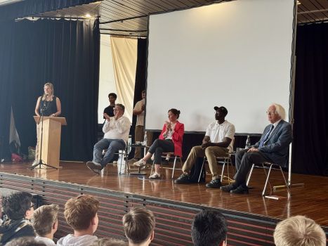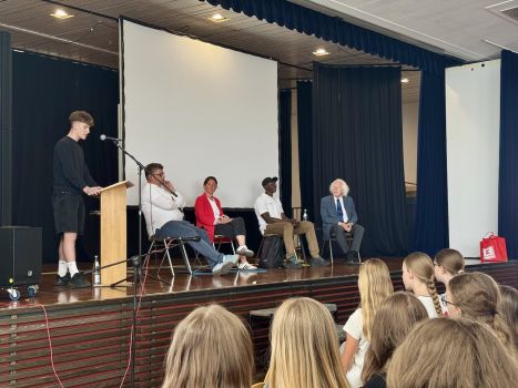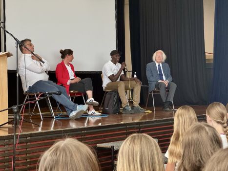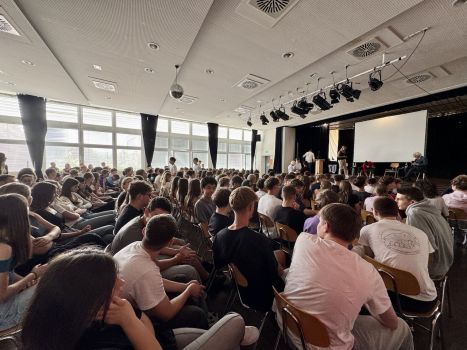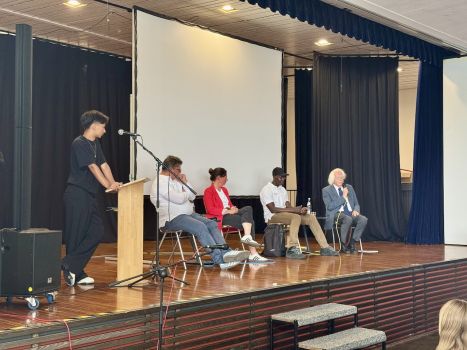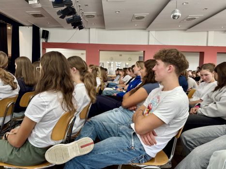 - Saikou Suwareh, der vor zehn Jahren aus Gambia nach Rottenburg kam, erzählte von seinem gefährlichen Weg und den Herausforderungen, die er überwinden musste. Und trotzdem waren seine Lebensfreude und Energie spürbar, als er in beeindruckendem Deutsch von seiner Heimat und von seinem neuem Zuhause Rottenburg den Schüler:innen berichtete.