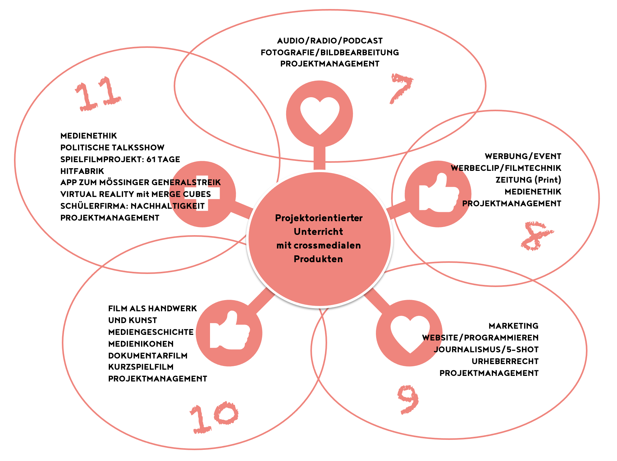 Es wird von Klasse 7 bis 10 dreistündig als Profilfach unterrichtet. In der Oberstufe kann das Fach in Form eines Seminarkurses weitergeführt werden. Grundsätzlich gilt: Das Fach "Mensch und Medien" ist curricular aufgebaut. Themen, Projekte und crossmediale Produkte werden in den Jahrgängen von 7 bis 11 nuanciert aufgegriffen und in ihrer Komplexität gesteigert. Dabei orientieren sich alle Projekte didaktisch am Modell "Deeper Learning" sowie an agilen Projektmanagementmethoden.